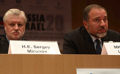 שיבחו את ביטול הוויזה. ליברמן ומירונוב, היום (צילום: אוהד צויגנברג)