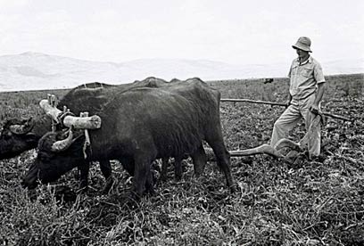 4. חברי קיבוץ עמיר חורשים את אדמת החולה במחרשת עץ ובעזרת ג'מוסים, 1940, צלם: זולטן קלוגר, ארכיון לע"מ