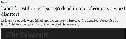 עיתוני בריטניה התייחסו בהרחבה לאסון, וה"טלגרף", שבימים האחרונים הקדיש את העמוד הראשי שלו כמעט אך ורק למסמכים הסודיים שהדליף אתר "ויקיליקס", פינה את המקום לסיקור השריפה בכרמל. הידיעה שהוקדשה לנושא הייתה שנייה רק לידיעה הראשית, שעסקה בהפסדה של אנגליה בקרב על אירוח המונדיאל ב-2018. "השריפה הקטלנית ביותר בתולדות ישראל מכלה את צפון המדינה", נכתב בכותרת.