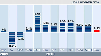 מדד המחירים לצרכן לחודש נובמבר, שפרסמה הערב (ד') הלמ"ס עלה בהתאם לציפיות המוקדמות בשיעור מתון של 0.1%. האינפלציה בפועל, המחושבת 12 חודשים לאחור (מדד נובמבר 2010 לעומת מדד נובמבר 2009), מסתכמת כעת ב-2.3% ונמצאת לכן מעט מעל מרכז תחום יעד האינפלציה השנתי שקבעה הממשלה (1%-3%).