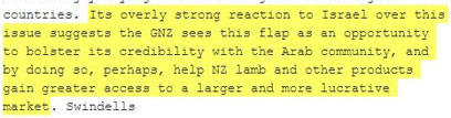 במסמך אמריקני מסווג נוסף, שנכתב יומיים לאחר מכן, תואר השלל שעשויה ניו-זילנד לקצור מהמהלך הדיפלומטי החריף בצורה אפילו מדויקת יותר. "התגובה החזקה מדי נגד ישראל בנושא הזה מעלה את האפשרות שממשלת ניו זילנד רואה בכך הזדמנות לצייר עצמה מהימנה יותר בעיני מדינות ערב, ועל ידי כך, אולי, לקדם גישה נרחבת יותר של כבשים מניו-זילנד ומוצרים ניו-זילנדיים לשוק גדול יותר ומשתלם יותר".
