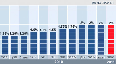 נגיד בנק ישראל, פרופ' סטנלי פישר, החליט הערב (ב') להשאיר את הריבית לחודש ינואר 2011 ללא שינוי, ברמה של 2%. ההפוגה בהעלאות הריבית, זה החודש השלישי ברציפות, באה לאחר שמחודש ספטמבר בשנה שעברה ביצע בנק ישראל שש העלאות ריבית, בשיעור מצטבר של 1.5%.