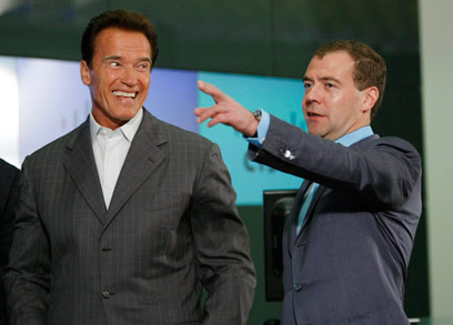 בודק אפשרויות לעתיד. שוורצנגר ונשיא רוסיה דמיטרי מדבדב (צילום: AP)