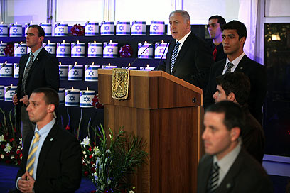 נתניהו על הבמה, המאבטחים מקיפים אותו (צילום: AP)