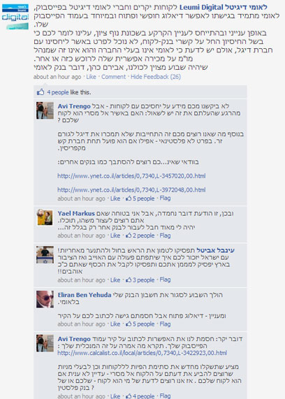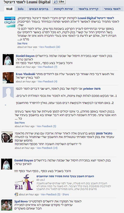 אך הטוקבקיסטים היום לא מסתפקים בהבעת דעתם מתחת לתגובות כתבות על הנושא, בעצומות אינטרנטיות חסרות תכלית, או בשיחה צעקנית עם נתן זהבי ברדיו. השימוש בפייסבוק פתח ערוץ ישיר בין הגולשים לבין הבנק, ושם הם בוחרים להביע את המחאה, לעתים בצורה בוטה ומתלהמת. אך בניגוד לטוקבקים, המחאה בפייסבוק וההודעות מלוות בחתימה בשם ובתמונה. "בנק לאומי יוצא במכירת חיסול של שכונה שלמה בירושלים לארגון טרור. והכל בשביל בצע כסף , כסף ועוד כסף !!!!" כתב היום דניאל דיין; אושרת תגר כתבה "מה קרה לכם ? - זה רציני ???- אתם באמת מתכוונים למכור שכונה שלמה לפלסטני ??", גולשים נוספים איימו שאם החברה תימכר, הם יעזבו את הבנק.