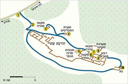 יוצאים מהחנייה (1) בשביל מסומן ירוק דרומה, לעבר הגבעה שממול. לאחר כ-200 מטר מגיע השביל לשער בגדר, ולידו שלט עם מפת האתר (2). נכנסים בשער ועולים מתונות בדרך רומית עתיקה. כ-100 מטר אחרי השער מבחינים מימין בשרידי אזור מגורים שבתיו בנויים חדרים-חדרים מסביב לחצרות פנימיות. על אחד החרסים שנמצאו באתר נכתב השם "עתרי", והחוקרים מניחים כי מדובר ביישוב עתרה, המוזכר בכתביו של יוסף בן מתתיהו (יוספוס פלאביוס).