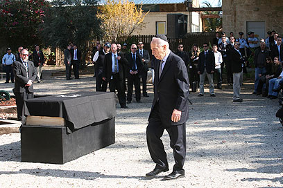 הנשיא פרס ליד ארונה של רעייתו סוניה (צילום: גיל יוחנן)