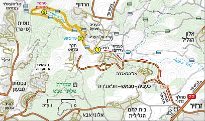 מצומת ישי נוסעים בכביש 77 לכיוון צומת המוביל. במחלף זרזיר פונים ימינה ומיד שמאלה בכיכר, עוברים מתחת לכביש, שוב שמאלה בכיכר הבאה ובזו שאחריה ימינה, עם כביש 7626. נוסעים לכיוון הכפר כעביה-דרום. במזלג הראשון ממשיכים למטה עם המסעף הימני. בכיכר ממשיכים ישר. הכביש עובר בפאתי הכפר, חוצה את נחל ציפורי על גבי גשר ועולה למעלה, עובר לצד בית העלמין ומגיע לחניון שליד מגרש הכדורגל. כאן חונים (1).