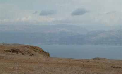 ים המלח כפי שנראה במעלה השביל במסלול נחל סלוודורה, הכתם החום הוא שפך נחל קדם הסמוך, הנכנס בשיטפון לים המלח