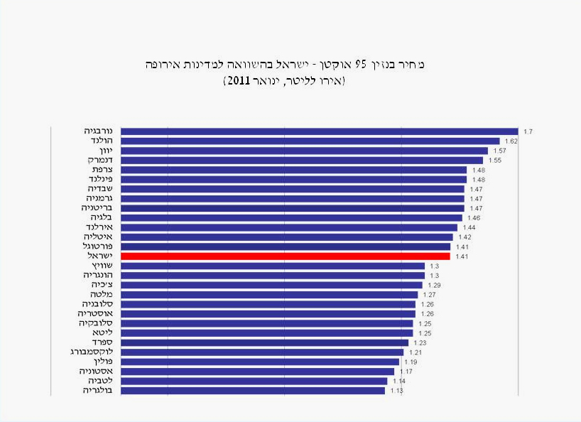 למרות שמדובר בנתונים ישנים, באוצר מתעקשים להבליט שמחיר ליטר בנזין בישראל בתחילת ינואר היה 1.41 אירו (שהם כ-7.1 שקל לליטר), זאת בהשוואה ל-1.7 אירו לליטר בנורבגיה, 1.48 אירו לליטר בצרפת ו-1.47 אירו לליטר בגרמניה ובבריטניה.
