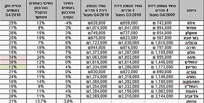 השמאי הממשלתי: ברבעון הרביעי של 2010 עלו מחירי הדירות ב-16 ערים נבחרות בשיעור של כ-3.8% בהשוואה לרבעון שלפניו - ובשיעור של 29.4% בהשוואה לרבעון הרביעי ב-2008 - שיאו של משבר הסאב פריים. הפערים הגדולים ביותר במחירי דירות באותו יישוב נמצאו בירושלים תל אביב וחיפה