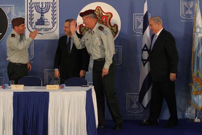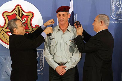 נתניהו וברק מעניקים את הדרגות לרב-אלוף גנץ (צילום: גיל יוחנן)