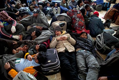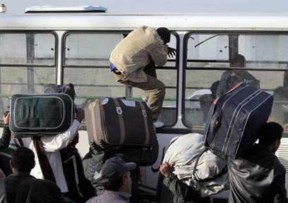אזרחים מצרים עולים על אוטובוס בדרך למצרים (צילום: AP)