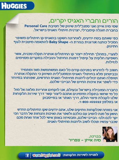 במודעות שפרסמה אתמול החברה נכתב: "חוגלה קימברלי מתנצלת על אי הנוחות שנגרמה לחלק מלקוחותיה, למרות שמדובר באירוע בעל אופי נקודתי אשר עלול היה להשפיע רק על חלק מהחיתולים (בעיקר במידה 4+), החברה לוקחת אחריות מלאה אל מול כל מי שהרגיש בתקלה ומבקשת ליצור קשר דרך שירות הלקוחות שלנו לקבלת פיצוי הולם ( 1-800-423232)".