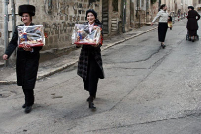 2. זוג צעיר בשכונת מאה שערים צועד עם משלוח מנות מושקע וארוז.