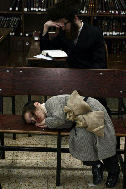3. חגיגת פורים בישיבה נמשכת עד לשעות הקטנות של הלילה. הילד הקטן נרדם על ספסל מזדמן.