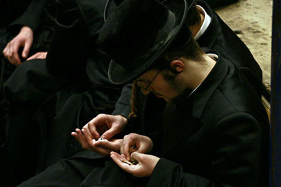 9. חסידוּת בעלז בירושלים. תלמידי הישיבה בוחנים את דמי הפורים שקיבלו משולחנו של האדמור המכובד.