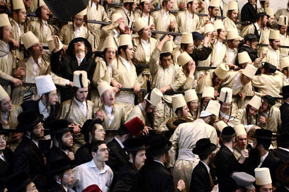 10. ותמונה אחרונה, אבל הפעם של חסידוּת צאנז בנתניה. המוני החסידים עומדים על הפארנצס (טריבונות - לוחות עץ על שלד של עמודי ברזל המוקם במיוחד עבור הטיש), וצופים יחד עם אדמור החסידות ב"פורים שפיל" - ההשתובבות לפורים.