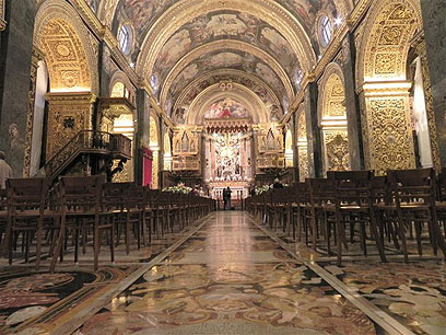 רצפת הכנסייה, שמתחתיה גם קבורים חלקם של האבירים, עשויה שיש איטלקי מרהיב ועליו עיטורים וציורים מהברית החדשה, כמו גם של דמויות וקדושים נוצריים. בכנסייה נמצא גם ציורו הגדול ביותר של הצייר האיטלקי, קראווג'יו, מ-1608 - "עריפת ראשו של סנט ג'ון הבפטיסט", ובו נראה ג'ון שניות לפני הוצאתו להורג.