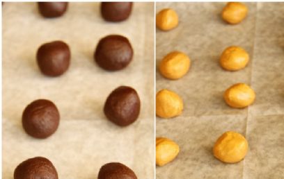 - יוצרים מהבצק 25 כדורים, גדולים מעט מכדורי חמאת הבוטנים. מניחים בתבנית אפייה מרופדת בנייר אפייה.