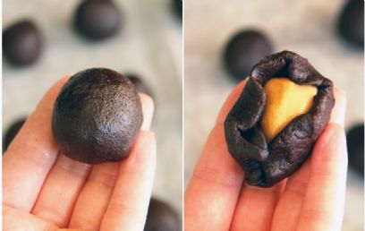 לוקחים כדור שוקולדי ובעזרת הידיים משטחים אותו עד שמתקבל עיגול דקיק. מניחים במרכזו כדור קטן של המלית, סוגרים את קצוות בצק השוקולד על מלית חמאת הבוטנים, מגלגלים בין הידיים עד לקבלת כדור מושלם, מניחים בתבנית האפייה.