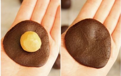 - בעזרת הידיים משטחים כל כדור בצק שוקולד לעיגול שטוח ודק, מניחים במרכזו כדור של מלית חמאת בוטנים, סוגרים את קצוות בצק השוקולד על גבי המלית כך שיעטוף אותה מכל צדדיה, ומגלגלים בין הידיים לקבלת כדור שלם.