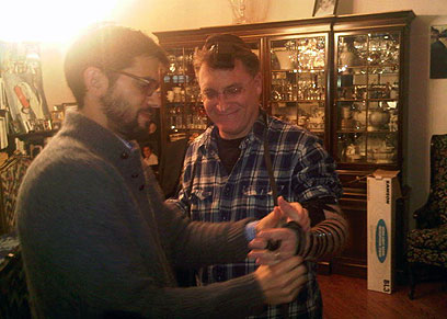 "אנחנו לא עושים מוזיקה רק כפרנסה, אלא גם כשליחות". חיים מרקוס מניח תפילין ללארי גוטרמן (צילום: Rabbi YB Friedman)