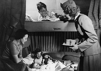 הנוסעים בירכו על קבלת השירות שהתווסף לטיסה. דיילת מגישה שתייה בתא מנוחה במטוס בואינג 377 (Stratocruiser)