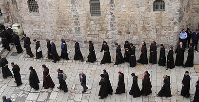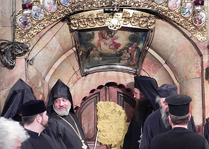 נציגי הפטריארכיה היוונית (מימין) והארמנית (משמאל) בפתח קברו של ישוע