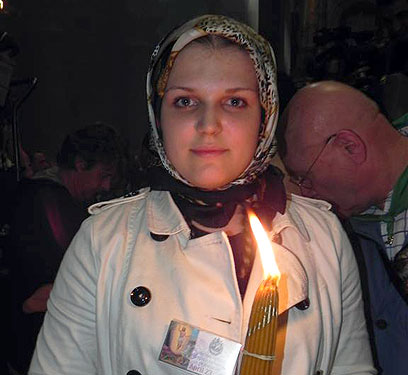 צליינית יוונית-אורתודוקסית עם נרות דולקים בידה. האמונה מעל לכל