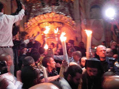 ואז זה אכן קרה. בסביבות השעה 14:00 הצטופפו אנשי הכמורה הבכירה בפתח האדיקולה, כשהם מלווים בשוטרים, האורות בכנסייה כובו ולפתע נדלקה אבוקה ואליה נהרו עשרות מאמינים אוחזים נרות שהכינו מראש, מנסים להעביר גם אליהם את אותה האש ששלח ישוע משמיים.