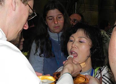 זהו גופו וזהו דמו. מאמינה מקבלת את לחם הקודש בטקס סעודת האדון