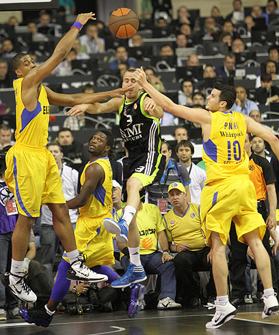 בורשטיין, מירוטיץ' ובלו רודפים אחרי הכדור (צילום: עוז מועלם)