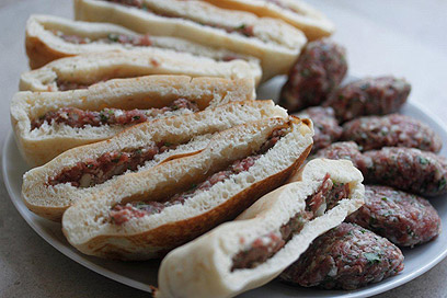 - בקערה גדולה מערבבים את כל החומרים. הדרך היחידה להבטיח שתתקבל תערובת מתובלת באופן אחיד היא ללוש ולערבב אותה בעזרת הידיים. כשהתערובת אחידה יוצרים ממנה קציצות פחוסות, לא גדולות. מכניסים כל קציצה לתוך חצי פיתה ומשטחים כך שהבשר הנא ימלא את כל חלל הפיתה.