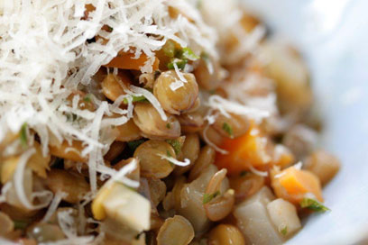 - התבשיל מוכן. מחלקים לקעריות הגשה. מזלפים מעט שמן זית בראש כל ערימת עדשים, מפזרים פטרוזיליה טרייה ומגררים פרמזן. אוכלים חם.