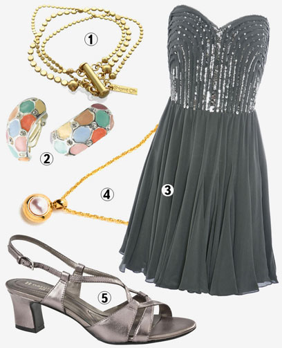 1. צמיד: שלומית אופיר, 135 שקל; 2. עגילים: קרן וולף, 450 שקל; 3. שמלה: רבקה טיילור לאתר ווישפאשיון, 700 שקל להשכרה; 4. שרשרת: אבגד, 25 שקל; 5. נעליים: נטורלייזר, 389 שקל