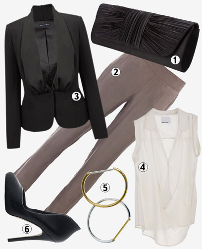 1. תיק קלאץ': המשביר לצרכן, 160 שקל; 2. מכנסיים: רוס אובטה, 749 שקל; 3. ז'קט: פרנץ' קונקשין, 1139 שקל; 4. חולצה מכופתרת: רוס אובטה, 449 שקל; 5. עגילים: הייץ' אנד אם, 60 שקל 6. נעלי עקב: אלדו, 449 שקל