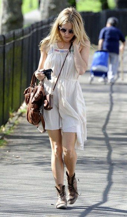 כבר כמה חודשים שאנחנו פוקחים עין ומשגיחים בתשומת לב על השיק ההיסטרי של סיינה מילר, והנה הגיעה השעה לפרגן; שימו לב לשילוב יוצא הדופן - אך בהחלט הורס לנו את הבריאות - בין שמלת הבסיס הלבנה והקיצית למגפי העור הבוטים והמחוספסים, וכמובן תיק הרכיבה בגוון החום שלא רק מתכתב עם המגפיים אלא גם מתאים לכל יום עבודה או לסיבוב שופינג. מושלם, אהבנו.
