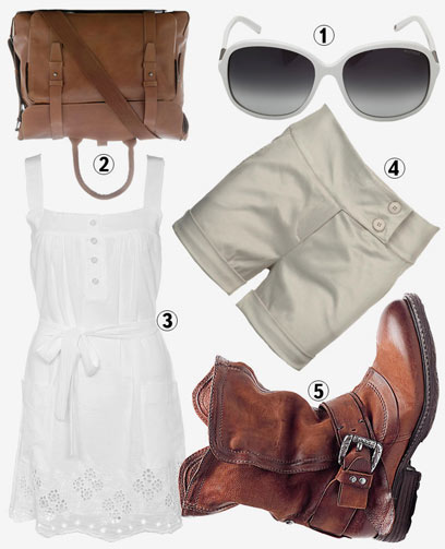 1. משקפי שמש: טומי הילפיגר לאירוקה, 1100 שקל; 2. תיק: אלדו, 799 שקל; 3.שמלה: הארטברייקר, 575 שקל; 4. מכנסיים קצרים: יופ, 179 שקל; 5. מגפיים: איירסטייפ לבוטיק אף אם, 1490 שקל