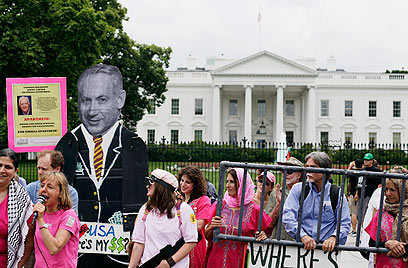 במהלך הפגישה, הפגנה נגד נתניהו מחוץ לבית הלבן (צילום: AP)