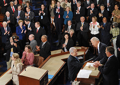 קבלת פנים חמה לנתניהו. "נאום לצורך יחסי ציבור" (צילום: AFP)