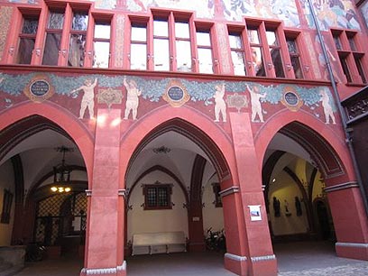 ציורי הקיר והפסלים מזהב מושכים את העין. בית העירייה בבזל