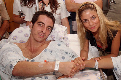 נפצע במלחמה. עם הזמרת שירי מימון בביה"ח (צילום: אלעד גרשגורן)
