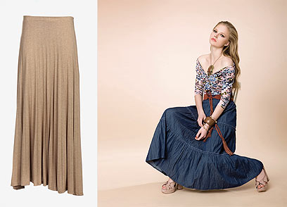 חצאית מקסי מבדים נשפכים, שיתאימו לפאשניסטית המקומית בשילוב גופיה ונעליים שטוחות, ניתן למצוא בקסטרו, אלומה, ברשקה, הייץ' אנד אם, רליג'ן לסטורי, קום איל פו, גוסטה, פרנץ' קונקשין, מסימו דוטי, ונדום לבוטיק דה בראנץ', בוטיק אליז, ופוקס. ושוב אני התעלפתי על חצאית פליסה באורך מידי, למרות שאת הפליסה ניתן למצוא גם בגזרת עפרון, קלוש ואיי. שיהיה בהצלחה.