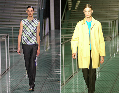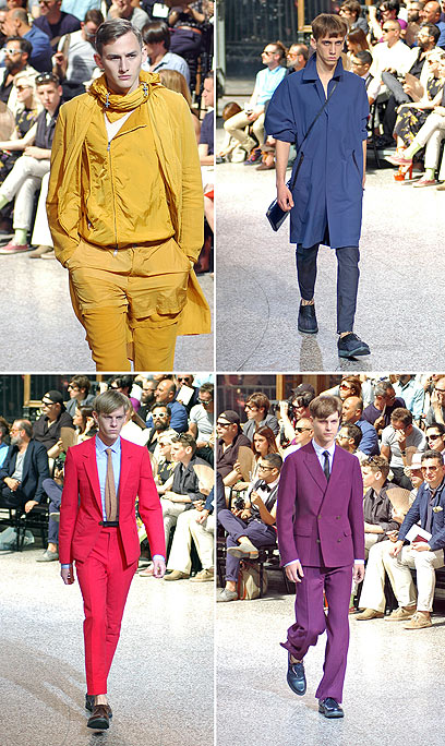 מגמת "הקולור בלוק" במלתחה הגברית תמשיך ותגלוש גם לקיץ הבא, הרבה מאוד פריטי לבוש בצבעי צהוב, ירוק וכחול, אך גם סגול ובורדו נראו על המסלולים. רף סימונס המשיך בקו הצבעוני אך שילב את הצבעים בהדפסי משבצות שכללו גם מעילים וטוניקות שהיו בניגוד מוחלט לחלל המנוכר בו התקיימה התצוגה, המשמש כאולם הכניסה לבנק הגדול בצרפת.