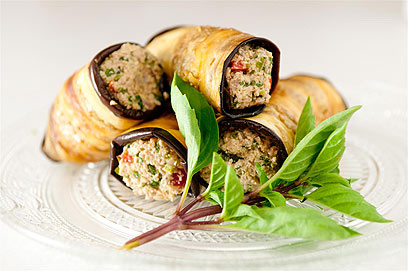 גלילות חציל ממולאות במלית אגוזים (צילום: ירון ברנר)