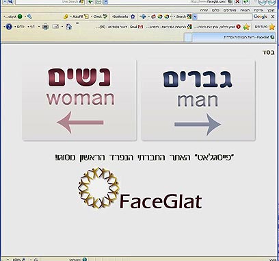 ברוכים הבאים ל"פייסגלאט" - הרשת החברתית הנפרדת לציבור החרדי. נשים - נא להירשם משמאל, גברים יכולים להירשם מימין. ואם אתם נשואים? "תיפגשו על הספה בסלון", אומר מנהל האתר