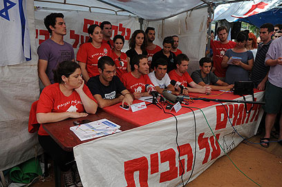 מסיבת העיתונאים במאהל. "נושאים עיניים לשולחן הזה" (צילום: ירון ברנר)