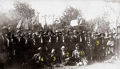 6. קן השומר הצעיר בבריסק: 1- מאיר פרידמן ראש הקן, 2- ז.ד. בגין, 3-ראש העיר, 4-עקיבא קרביצקי, 5- מנחם בגין מניף את דגל הקן.