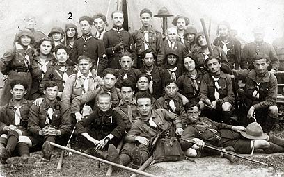 12. טיול משותף של חניכי השוה"צ בריסק, צעירים ובוגרים, חלקם כבר התגייסו לצבא פולין (עומדים במדים). 1-מנחם בגין, 2-רחל אחותו.